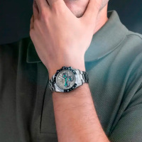 Корпус: Ударопрочный корпус часов сделан из нержавеющей стали. Неподвижный безель из керамики чёрного цвета. Серый циферблат со стрелками и часовыми индексами в виде штрихов с нанесенным люминесцентным покрытием, которое светится в темноте после непродолжительной зарядки на свету. Минеральное стекло устойчивое к возникновению царапин. Рифленая заводная головка с защитой. Диаметр: 39 мм. Водонепроницаемость: 100 м.