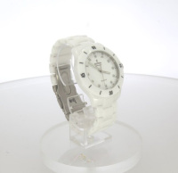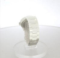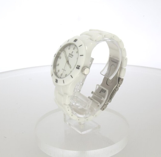Корпус: Корпус выполнен из белой керамики, придающей часам изысканность и устойчивость к царапинам. Циферблат белого цвета оформлен серебристыми метками с эффектом мерцания, стрелки с люминесцентным покрытием, обеспечивающим хорошую читаемость в темноте. Циферблат защищён минеральным стеклом. Диаметр: 38 мм. Водонепроницаемость 50 м. позволяет использовать часы в повседневных условиях, защищая от дождя и брызг.