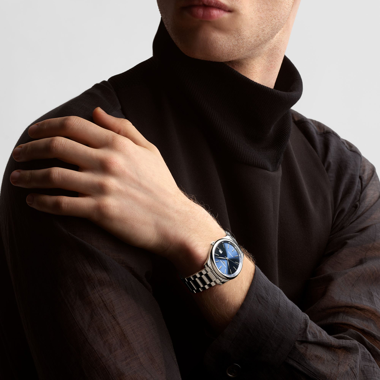 Корпус: Нержавеющая сталь. Циферблат синего цвета, серебристые стрелки и риски. Сапфировое стекло с антибликовым покрытием. Водонепроницаемость 30 метров. Размер 42 мм.