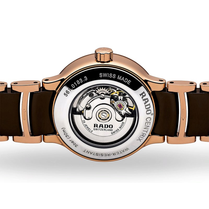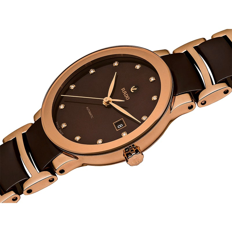 Корпус: Нержавеющая сталь + PVD-покрытие из розового золота, сапфировое стекло. Циферблат коричневого цвета с 12-ю бриллиантами. Водонепроницаемость 30 метров. Диаметр 28 мм.