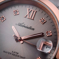 Корпус: Круглый корпус выполнен из полированной нержавеющей стали с частичным PVD покрытием розового золота. Циферблат с метками в виде точек из фианитов и римской цифры 12 выполнен по технологии Sunray (солнечные лучи). Стрелки с покрытием SuperLuminova, которое обеспечивает длительную подсветку в темное время суток. Минеральное стекло с сапфировым покрытием. Рифленая заводная головка. Диаметр корпуса составляет 36 мм, толщина 9 мм. Водостойкость WR 50 (мытье рук, дождь).