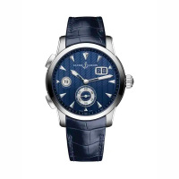 Функции: Индикация часов и минут при помощи центральных стрелок. Dual Time. Уникальный механизм быстрой коррекции времени. Индикатор «домашнего» времени, большой указатель даты, секундная стрелка на дополнительном циферблате.