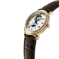 Функции: Центральные часовая, минутная и секундная стрелки, стрелочный указатель даты и индикация фазы Луны. Мосты и платина механизма частично скелетонизированы, видимые элементы декорированы жемчужным зернением, ротор автоподзавода цвета золота, шляпки винтов с синением и полировкой.
