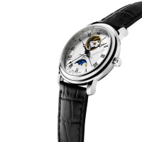 Функции: Центральные часовая, минутная и секундная стрелки, стрелочный указатель даты и индикация фазы Луны. Мосты и платина механизма частично скелетонизированы, видимые элементы декорированы жемчужным зернением, ротор автоподзавода цвета золота, шляпки винтов с синением и полировкой.