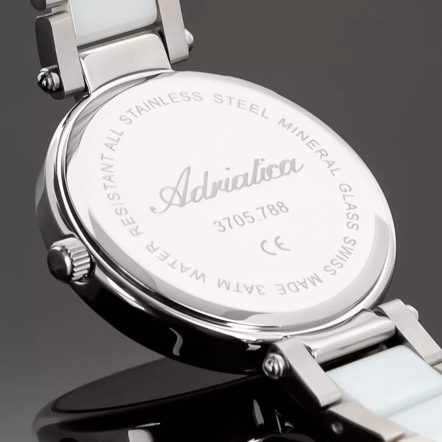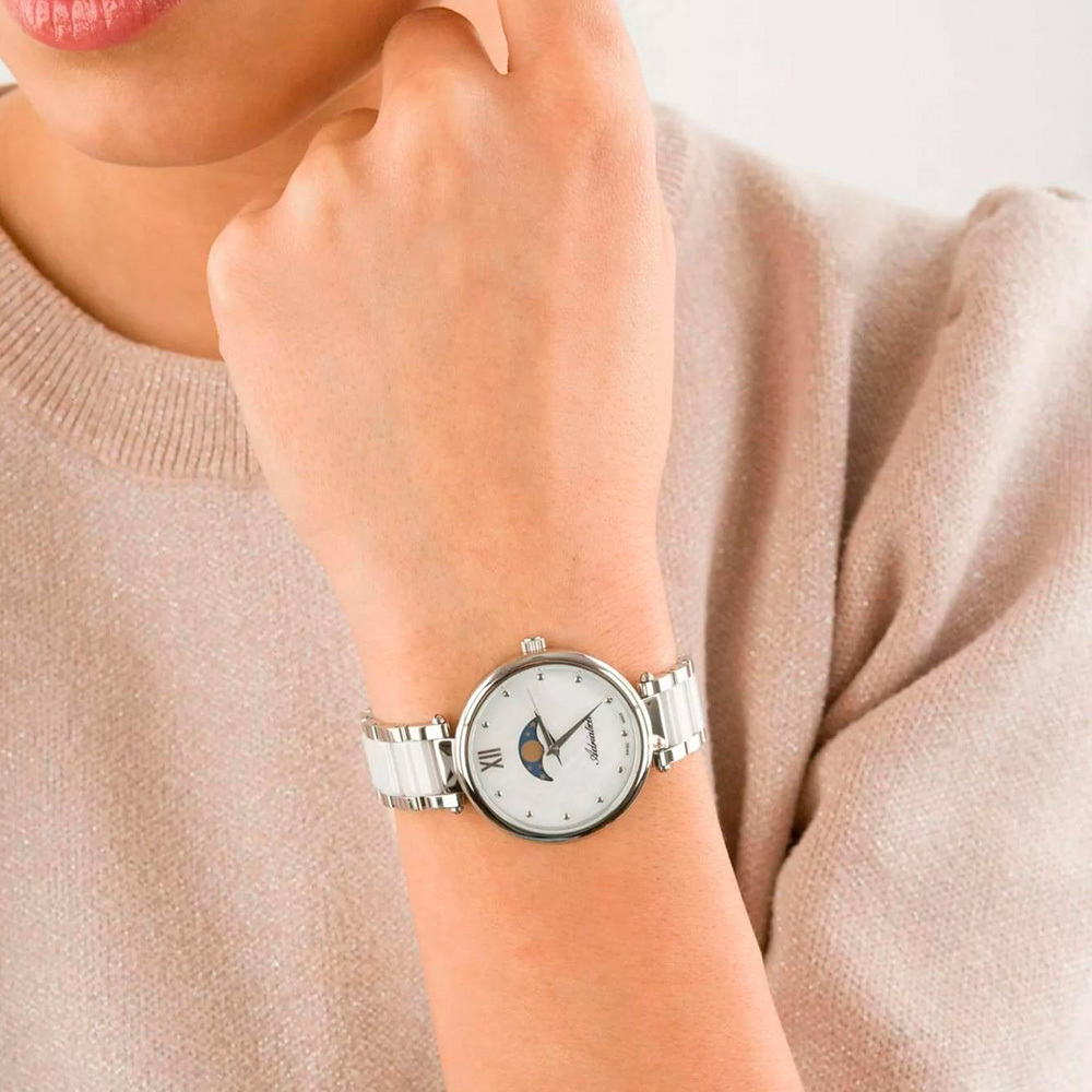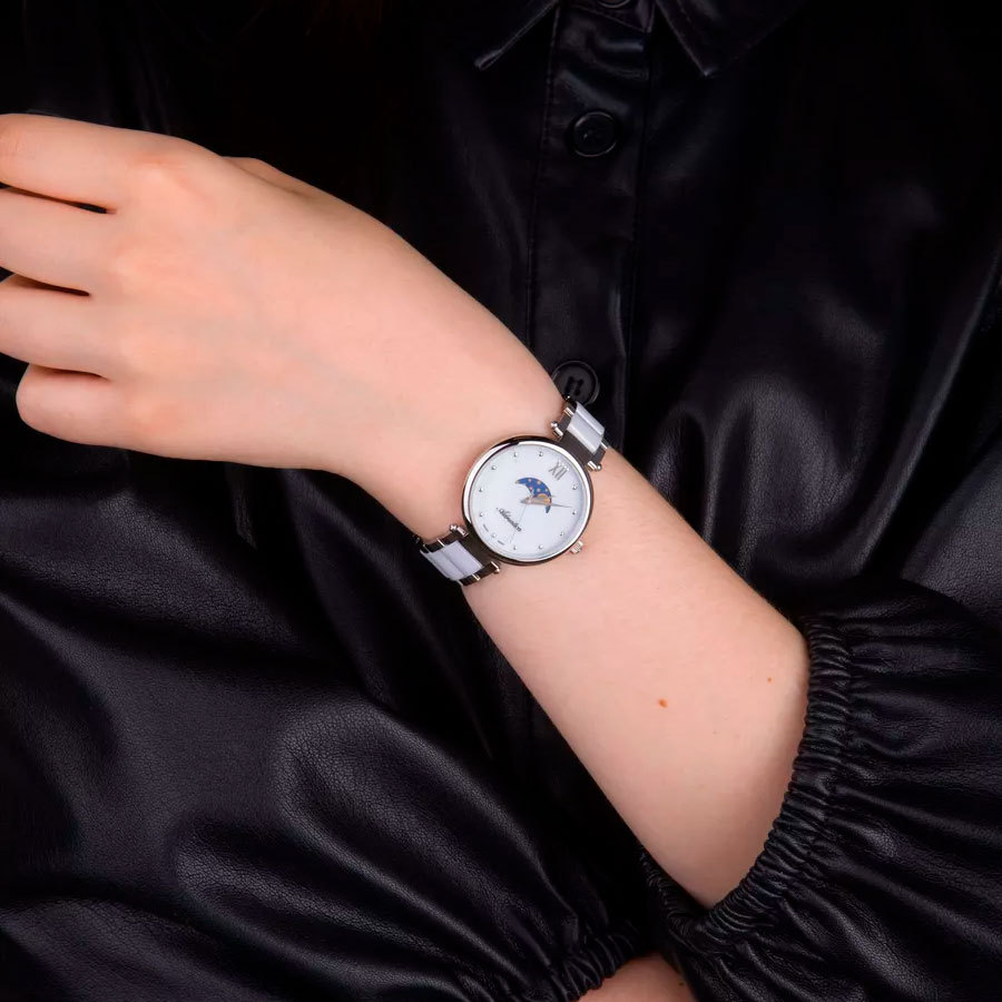 Ремешок: Браслет выполнен из нержавеющей стали с керамическими вставками белого цвета.