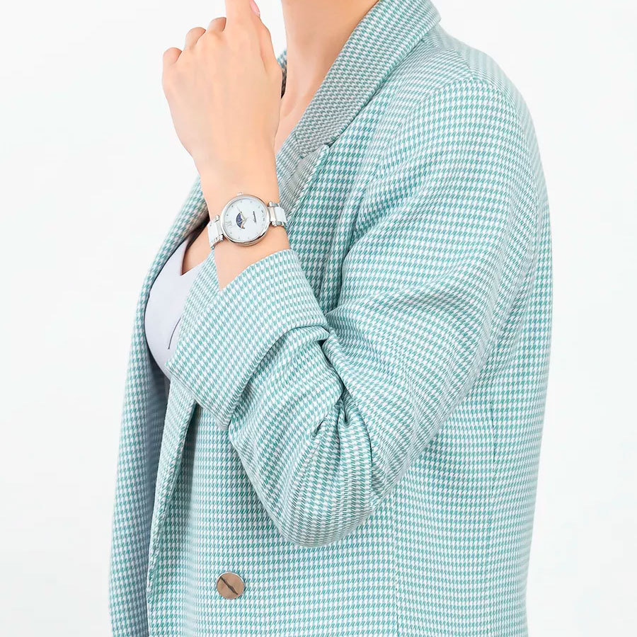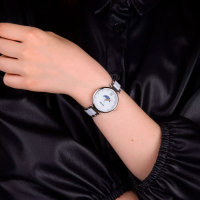 Корпус: Круглый корпус выполнен из полированной нержавеющей стали. Метки в виде точек на перламутровом циферблате белого цвета. Минеральное стекло с сапфировым покрытием. Диаметр корпуса составляет 34 мм, толщина 7 мм. Водостойкость WR 50 (мытье рук, дождь).