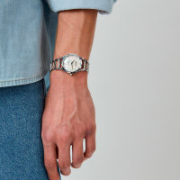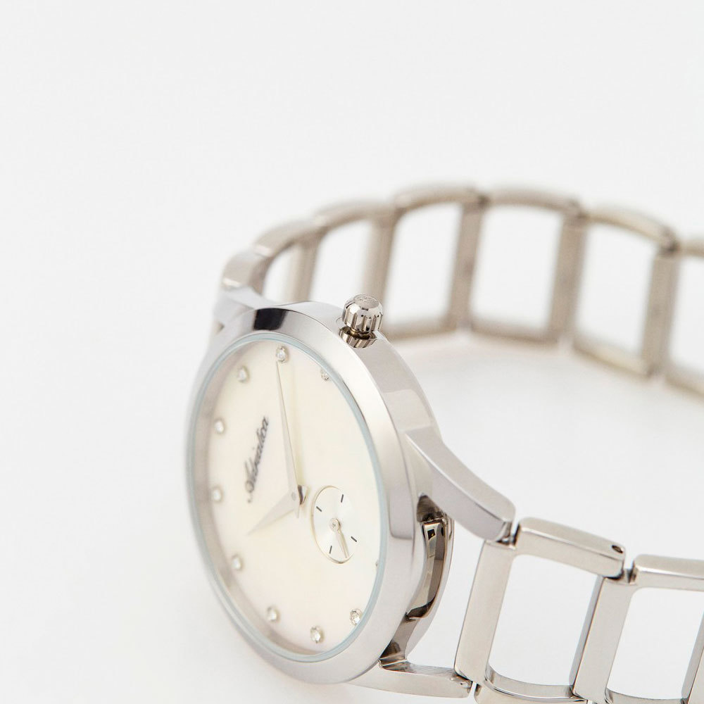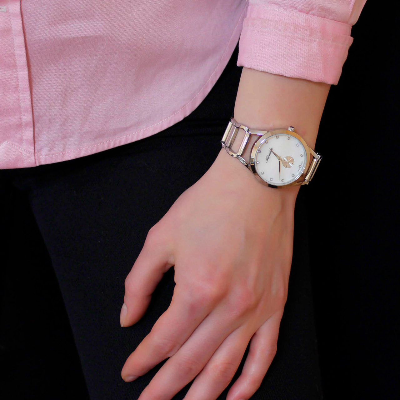 Корпус: Круглый корпус выполнен из полированной нержавеющей стали. Перламутровый белый циферблат украшен 12 фианитами. Минеральное стекло устойчивое к появлению царапин, обладает высокой прозрачностью. Диаметр корпуса составляет 34 мм, толщина 7 мм. Водостойкость WR 30 (мытье рук, дождь).