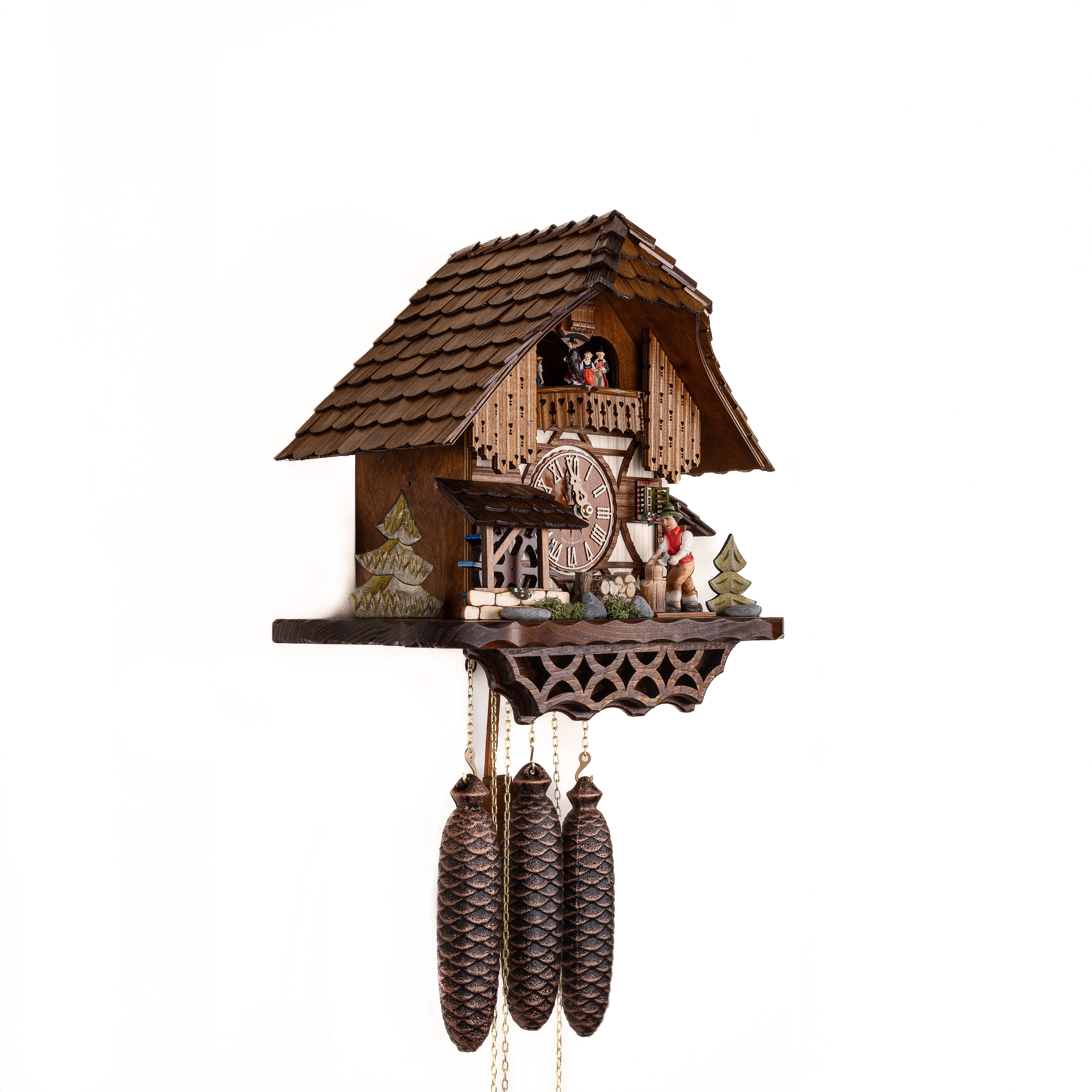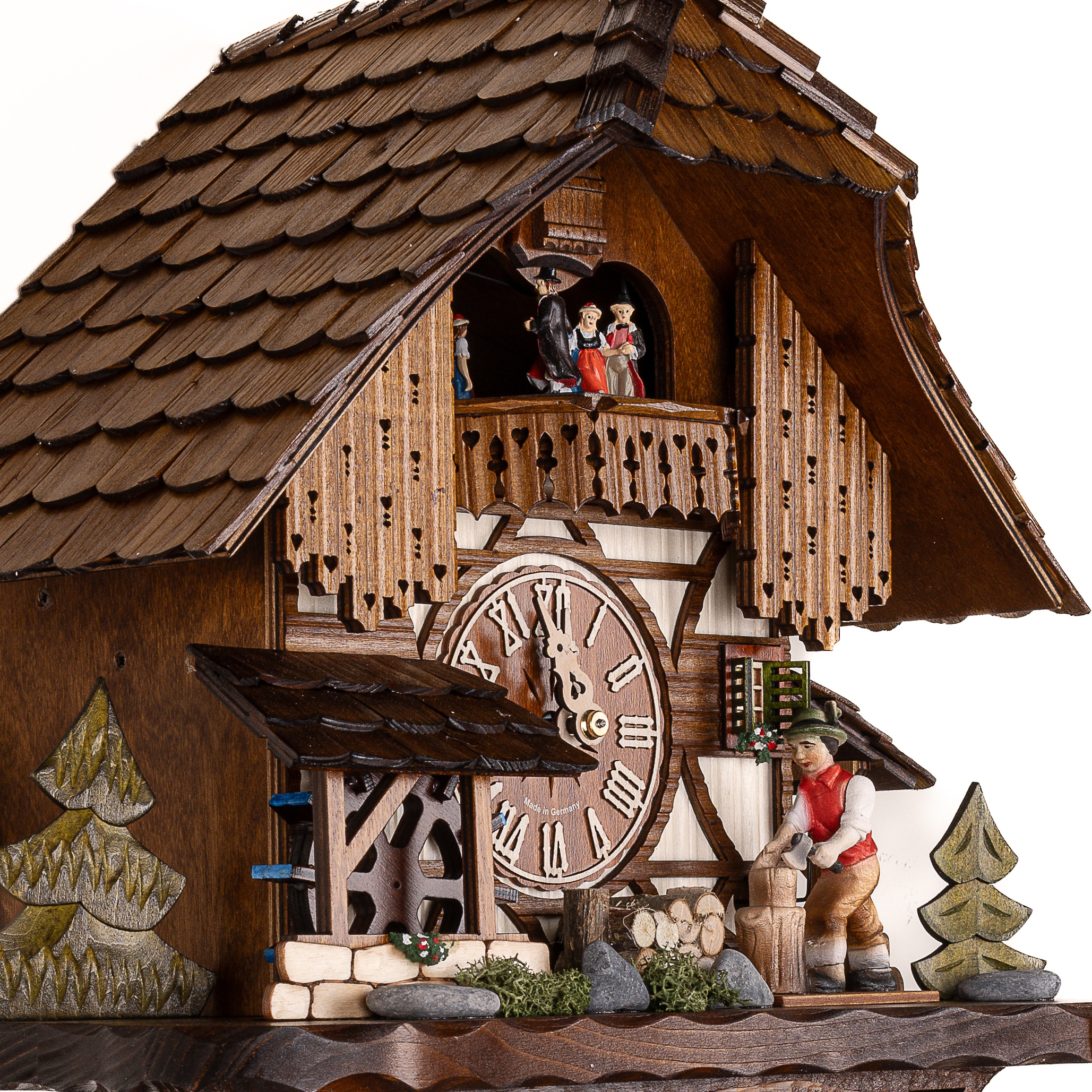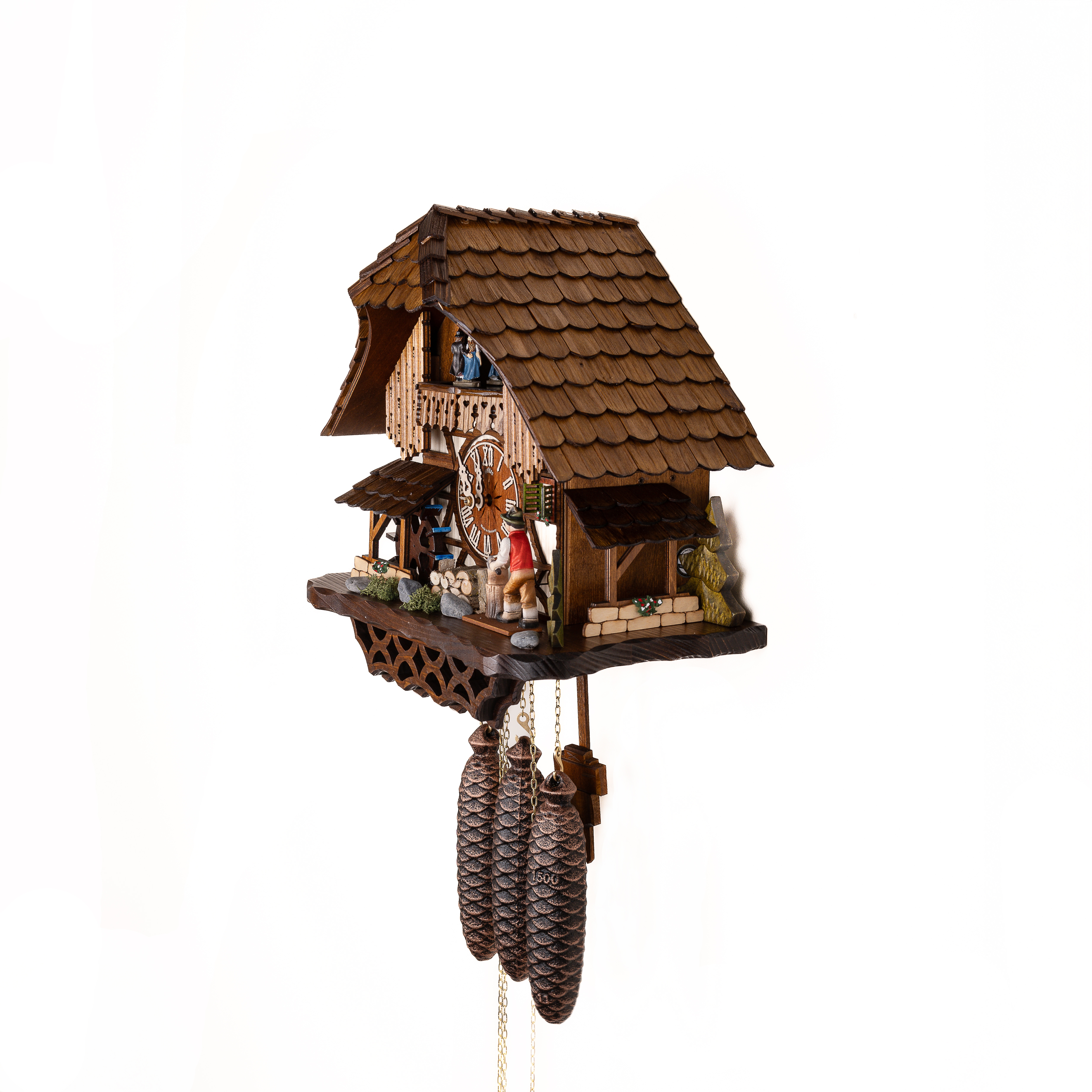 Механизм: Механические часы с кукушкой, которые работают от гирь на цепной тяге. Сделан механизм на фирме SBS-Feintechnik GmbH & Co. KG Германия. Запас хода на 8 дней. Ручное отключение звука. Шварцвальдский дом с подвижным дровосеком, мельничным колесом и танцующими парами на балконе. В каждые пол часа кукушка появляется из своего домика, наклоняется и воспроизводит звук кукушки (ку-ку) один раз, в каждый полный час она кукует столько раз сколько показывают стрелки на часах. После этого на балкончике начинают кружиться в танце деревянные фигурки под музыку (2 мелодии чередуются). Одна гиря в данных часах отвечает за ход часового механизма, вторая за механизм кукушки, а третья за воспроизведение музыки, как в музыкальной шкатулке, и за движение декоративных фигурок, водяной мельницы, танцующих пар на балконе. В то время пока кукушка кукует дровосек колет дрова и продолжает это делать пока кукушка не остановится.