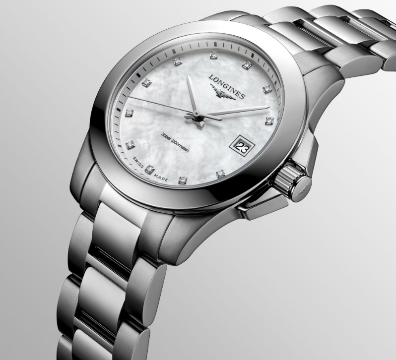 Корпус: Нержавеющая сталь. Циферблат белый перламутровый, 11 бриллиантов. Сапфировое стекло с антибликовым покрытием. Водонепроницаемость 300 метров. Размер 34 мм.