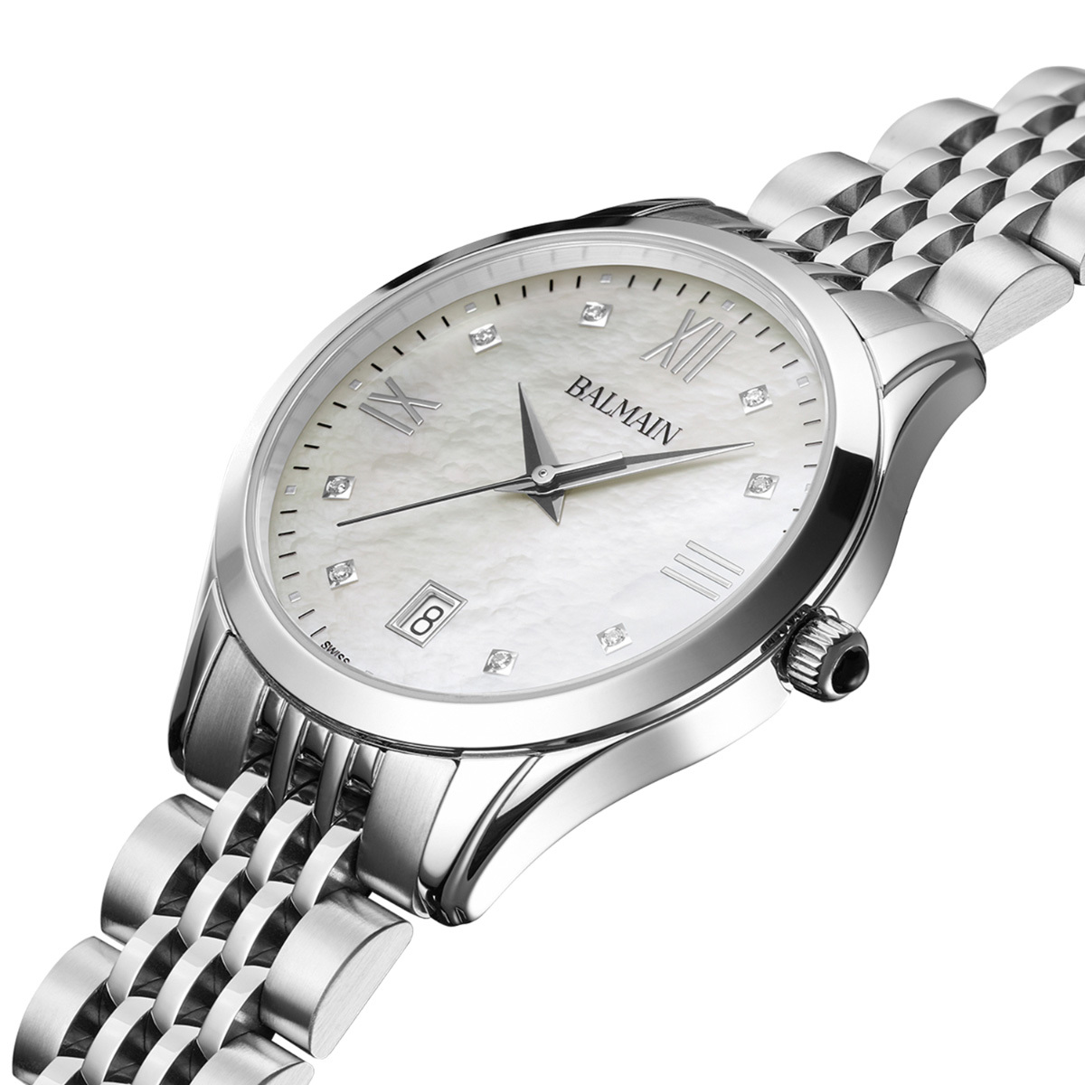 Корпус: Корпус выполнен из нержавеющей стали 316L, которая чрезвычайно прочна и устойчива к коррозии, поверхность с полировкой до зеркального блеска. Циферблат белый перламутровый украшен 8 бриллиантами. Часовые индексы и стрелки выполнены из стали. Сапфировое стекло, устойчивое к появлению царапин, обладающее высокой прозрачностью. Диаметр: 30 мм. Водостойкость: 50 м.