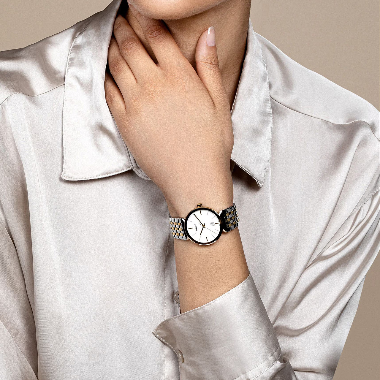 Корпус: Корпус из нержавеющей стали 316L с повышенной устойчивостью к коррозии, с частичным PVD-покрытием цвета жёлтого золота, поверхности с матовой шлифовкой – сатинированием и полировкой до зеркального блеска. Циферблат винтажно-белого цвета с шлифовкой. Часовые индексы и стрелки отполированы до алмазного блеска с позолотой. Фирменное сапфировое стекло Rado с металлическим покрытием. Диаметр корпуса составляет: 30 мм. Водостойкость: 50 м.