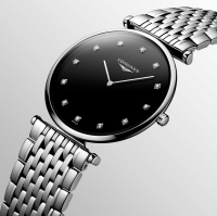 Корпус: Нержавеющая сталь, сапфировое стекло, 12 бриллиантов на циферблате. Размер 29 мм, водонепроницаемость 30 метров. Циферблат – черный.