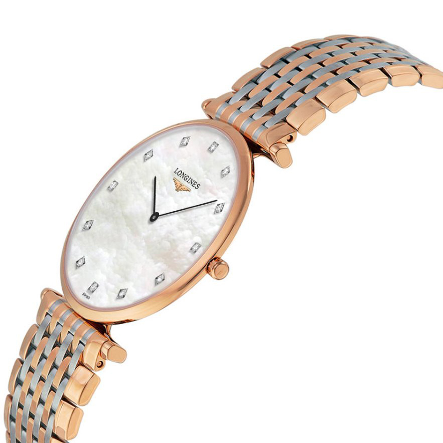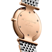 Корпус: Нержавеющая сталь + PVD-покрытие из розового золота, сапфировое стекло, 12 бриллиантов на циферблате. Размер 33 мм, водонепроницаемость 30 метров. Циферблат – перламутровый белый.