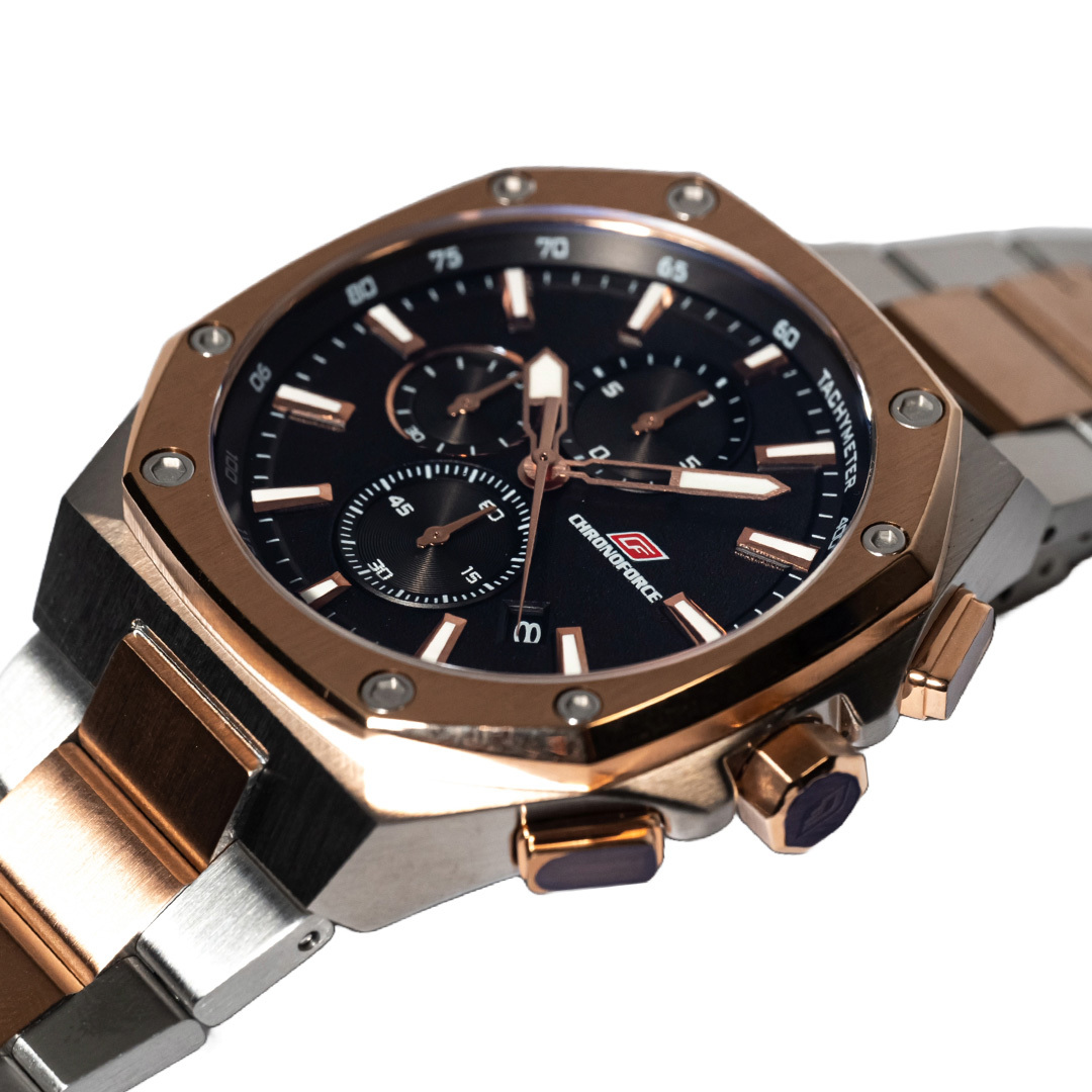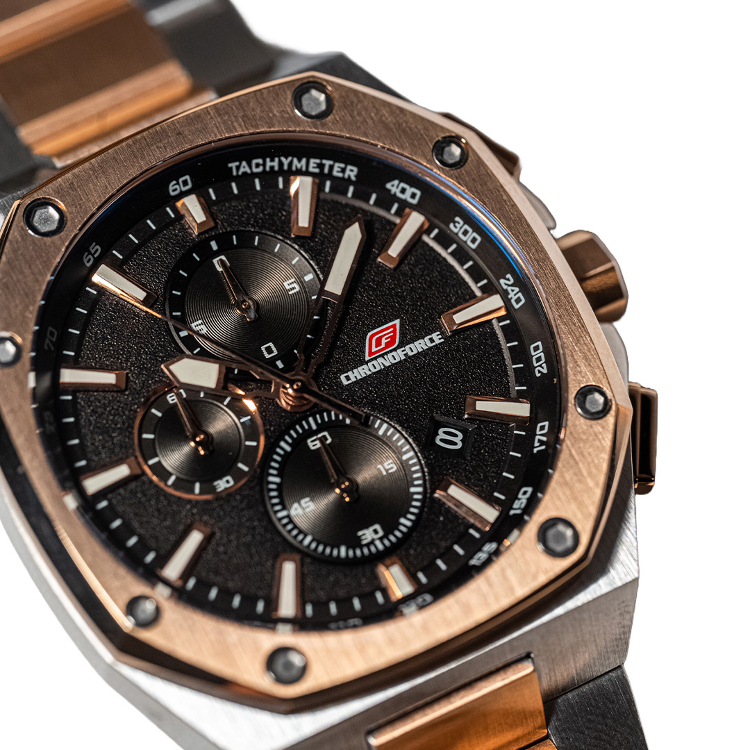 Ремешок: Браслет изготовлен из высококачественной нержавеющей стали с частичным IP покрытием розового золота. Каждые часы бренда Chronoforce имеют уникальную упаковку, в виде мотоциклетного шлема.