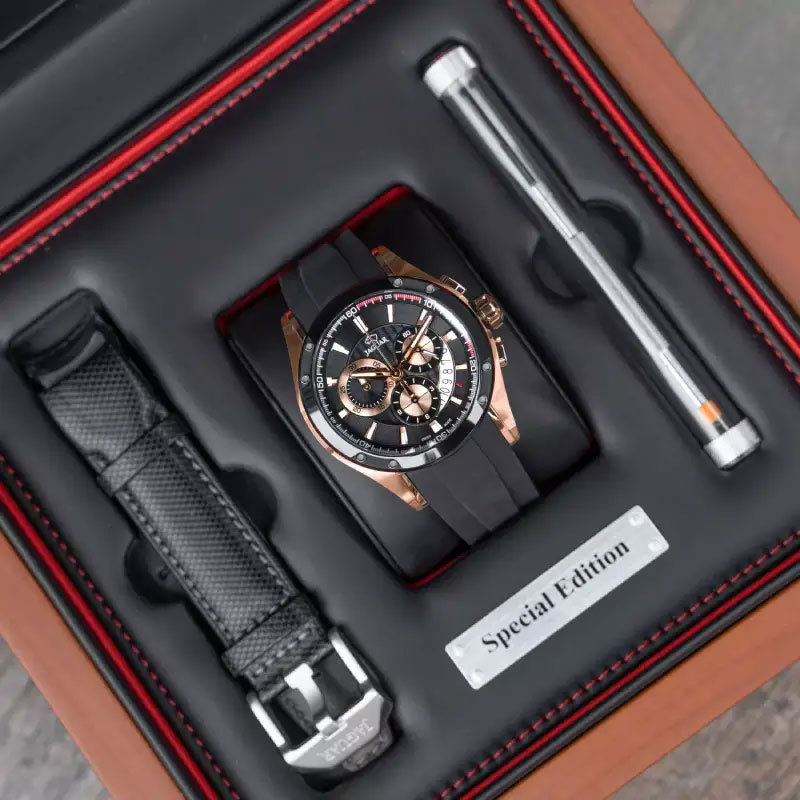 Ремешок: Эти часы оснащены черным каучуковым ремешком с двойной кнопочной застежкой, которая позволяет легко открывать и закрывать ремешок, минимизируя его толщину на нижней стороне запястья. Дополнительно в комплете чёрный кожаный рмень.