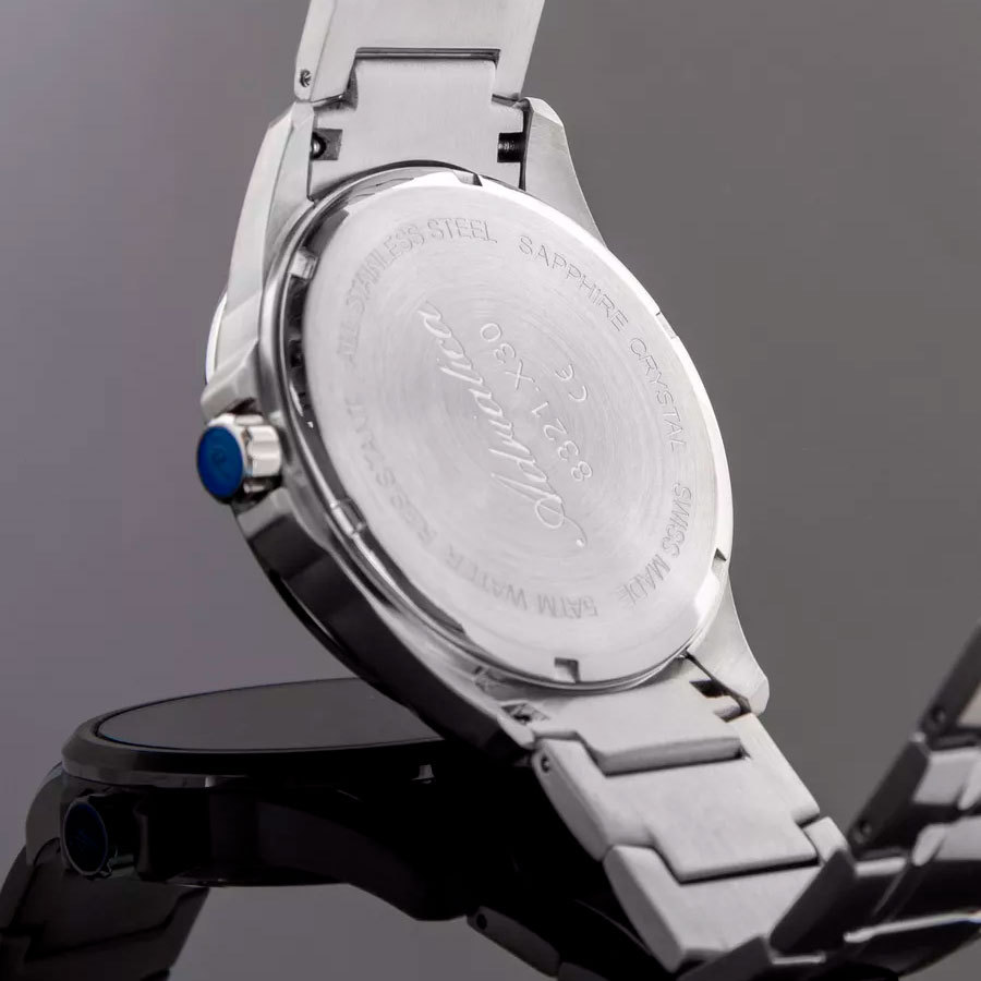 Корпус: Круглый корпус выполнен из полированной нержавеющей стали. Чёрный циферблат с узором гильоше. Накладные часовые индексыв выполненый из стали. Стрелки с покрытием SuperLuminova, которое обеспечивает подсветку в темное время суток. Сапфировое стекло устойчивое к возникновению царапин. Диаметр корпуса составляет 46 мм, толщина 11 мм. Водостойкость WR 50 (мытье рук, дождь).
