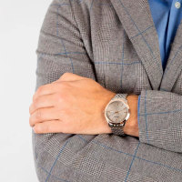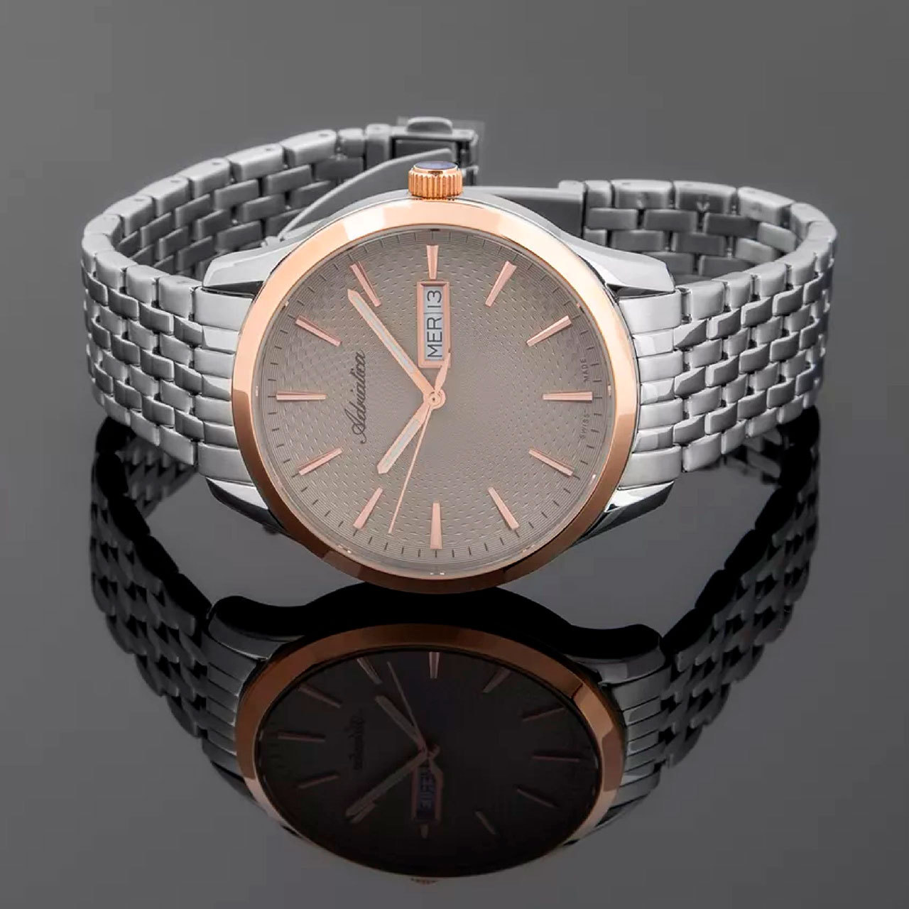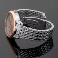 Корпус: Круглый корпус выполнен из полированной нержавеющей стали с PVD покрытием цвета розового золота. Серый циферблат с узором гильоше. Накладные часовые индексы и стрелки выполненый из сталии с покрытием золота. Стрелки с покрытием SuperLuminova, которое обеспечивает подсветку в темное время суток. Сапфировое стекло устойчивое к возникновению царапин. Диаметр корпуса составляет 40 мм, толщина 7 мм. Водостойкость WR 50 (мытье рук, дождь).