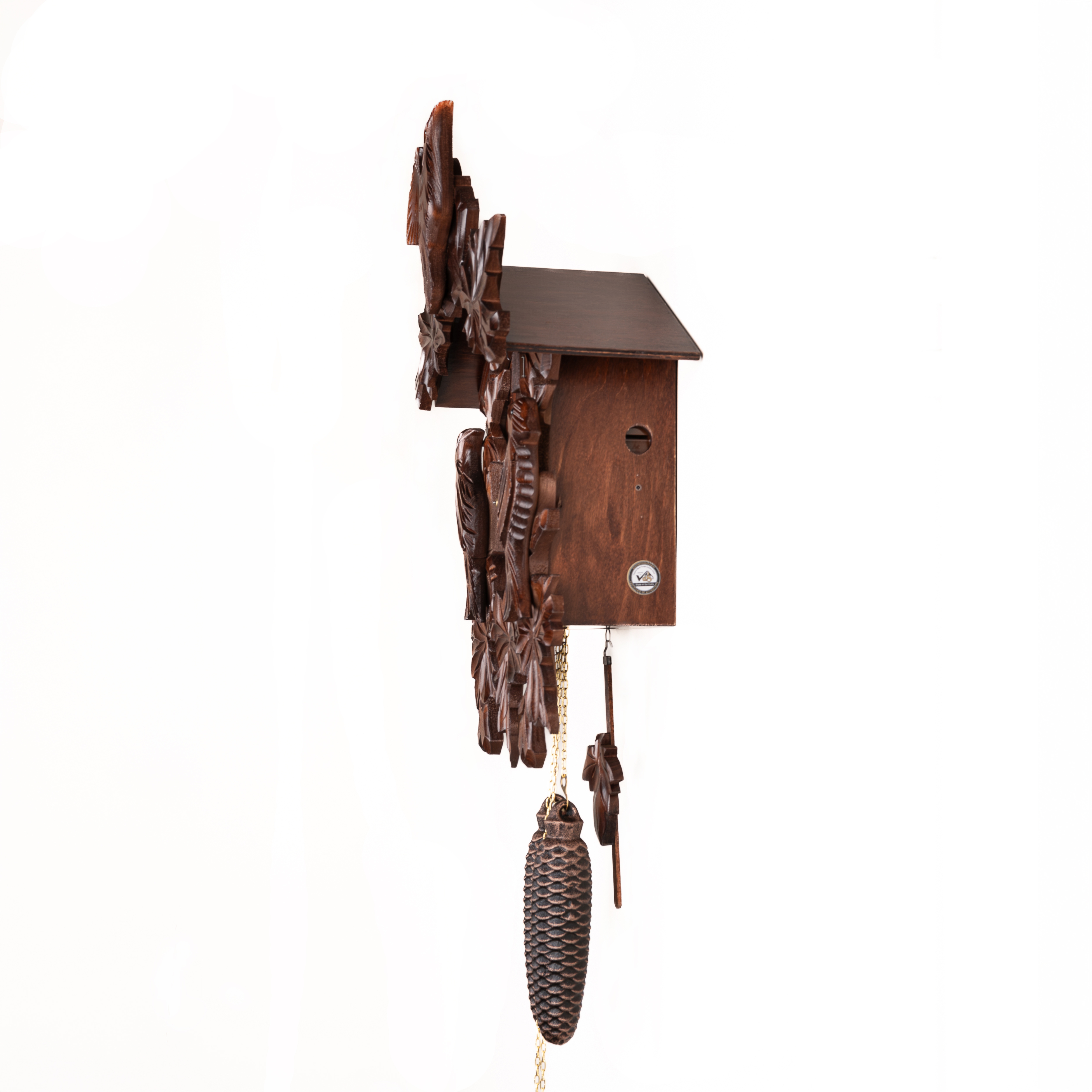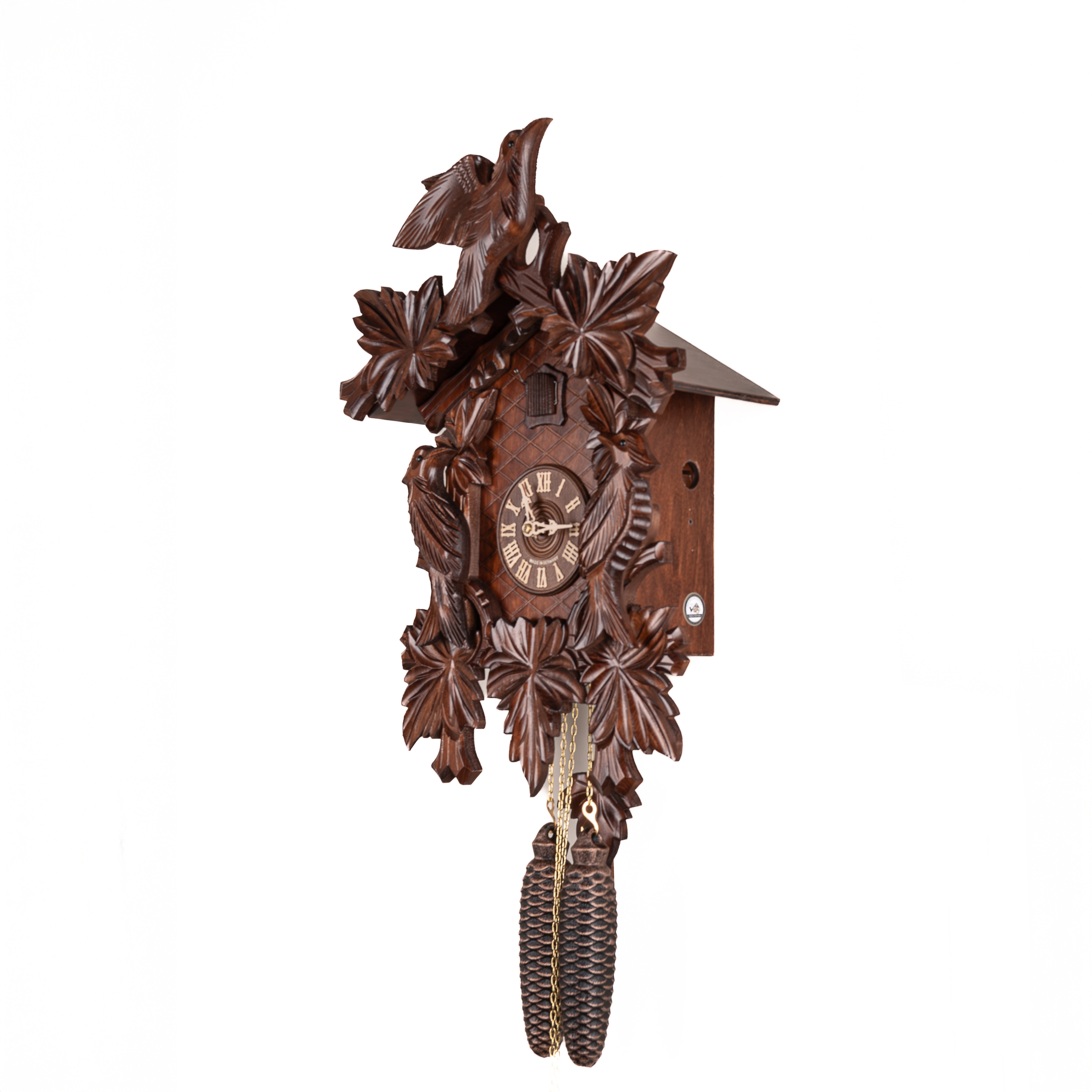 Механизм: Механические часы с кукушкой, которые работают от гирь на цепной тяге. Сделан на фирме SBS-Feintechnik GmbH & Co. KG Германия. Запас хода на 8 дней. Ручное отключение звука. В каждые пол часа кукушка появляется из своего домика, наклоняется и воспроизводит звук кукушки (ку-ку) один раз, в каждый полный час она кукует столько раз сколько показывают стрелки на часах. Одна гиря в данных часах отвечает за ход часового механизма, а вторая за механизм кукушки.