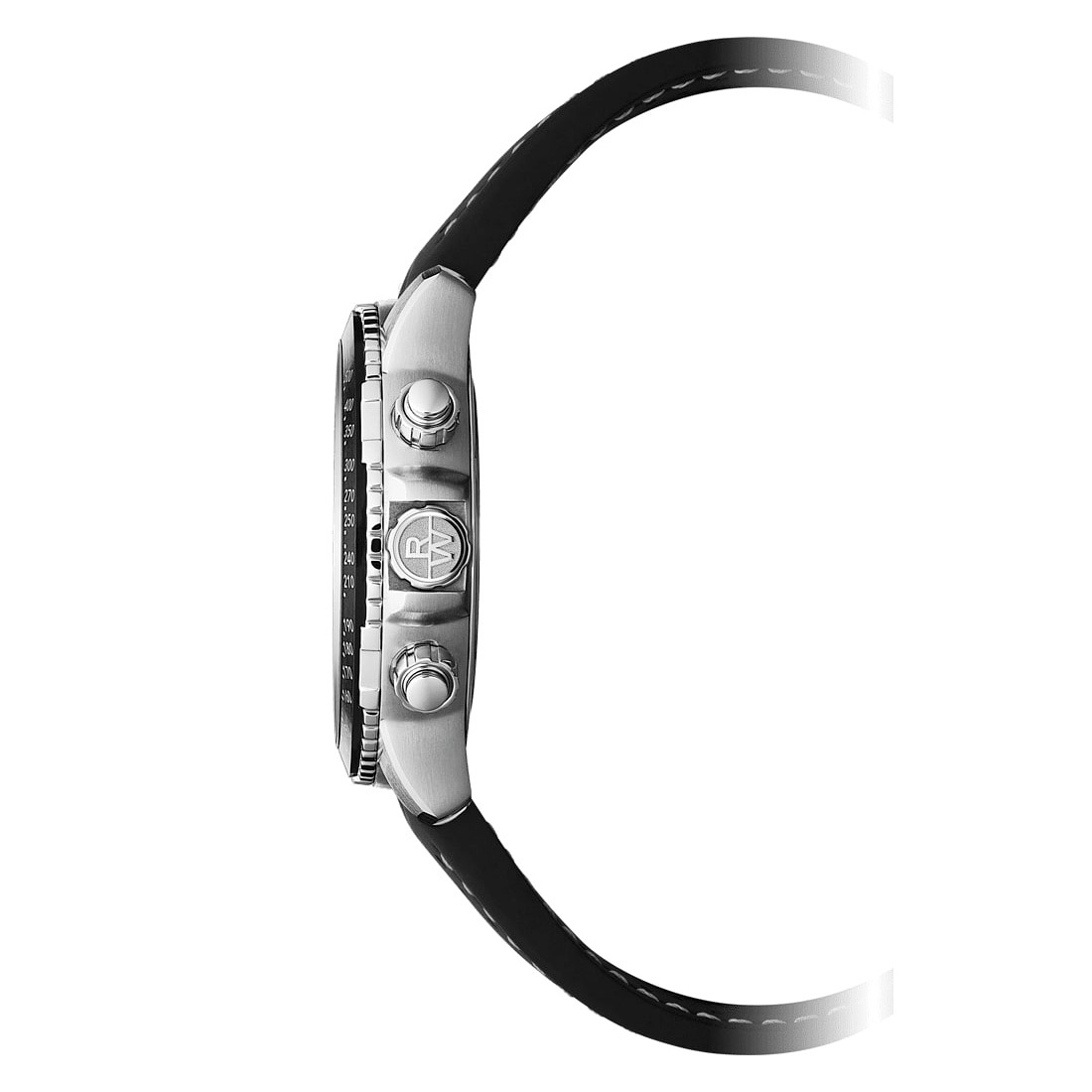 Корпус: Корпус из нержавеющей стали марки 316L. Безель с разметкой тахиметрической шкалы. Черный циферблат с шлифовкой и рельефной поверхностью. Часовые индексы и цифры выполнены методом аппликации, стрелки хронографа с желтым покрытием. Люминесцентное покрытие Super-Luminova на стрелках и часовых индексах. Сапфировое стекло. Переводная коронка украшена логотипом RW. Диаметр 43 мм, толщина 11.9 мм. Водостойкость 300 метров.