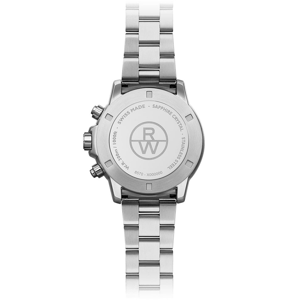 Корпус: Корпус круглой формы выполнен из нержавеющей стали марки 316L. Безель с разметкой тахиметрической шкалы. Поверхность черного циферблата с матовой обработкой. Дополнительные индикаторы хронографа утоплены относительно плоскости основного циферблата. Часовые индексы, выполненные методом аппликации, и стрелки с серебристым покрытием. Люминесцентное покрытие Super-Luminova на стрелках и часовых индексах. Сапфировое стекло имеет повышенную устойчивость к возникновению царапин. Переводная коронка украшена логотипом RW. Задняя крышка имеет резьбовое крепление к корпусу. Диаметр корпуса модели составляет 43 мм, толщина - 11.9 мм. Водостойкость 300 метров (1000 ft / 30 АТМ).