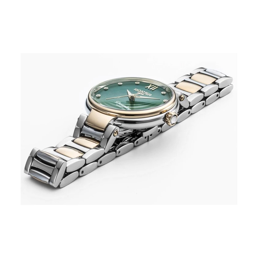 Корпус: Круглый корпус выполнен из нержавеющей стали 316L с частичным IP покрытием цвета жёлтого золота. Перламутровый зелёный циферблат. Метки в виде точек. Устойчивое к возникновению мелких механических повреждений сапфировое стекло. Диаметр корпуса составляет 33 мм. Водостойкость WR 50 м.