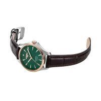 Корпус: Корпус выполнен из высококачественной нержавеющей стали 316L с полировкой и матовой шлифовкой - сатинированием с частичным IP покрытием. Перламутровый циферблат зелёного цвета декорирован 1 бриллиантом, золотистые стрелки и часовые индексы. Стрелки с люминесцентным покрытием для оптимальной разборчивости в условиях низкой освещенности. Сапфировое стекло с антибликовым покрытием. Диаметр: 36 мм. Водозащита: 50 м.
