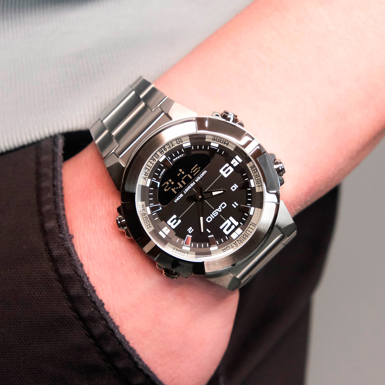 Функции: Аналогово - цифровое отображение текущего времени. Секундомер с точностью показаний 1/100 сек и максимальным временем измерения - 24 час. Таймер обратного осчета. 3 ежедневных будильника. Функция повтора сигнала будильника (Snooze). Автоматический календарь. Записная телефонная книжка для хранения фамилий и номеров телефонов. Максимальная емкость - 30 абонентов. Электронный циферблат подсвечивается светодиодом.