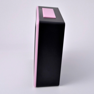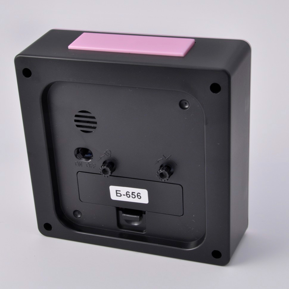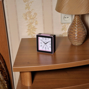 Материал и цвет: Корпус будильника квадратной формы сделан из чёрного пластика со вставкой фиолетового цвета. Стекло – пластиковое. Белый циферблат с чёрными арабскими цифрами.