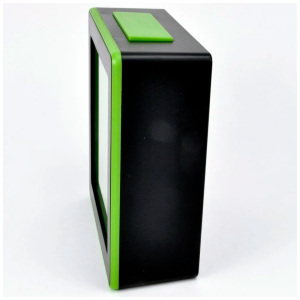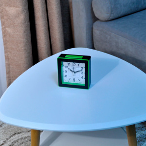 Материал и цвет: Корпус будильника квадратной формы сделан из чёрного пластика со вставкой зелёного цвета. Стекло – пластиковое. Белый циферблат с чёрными арабскими цифрами.