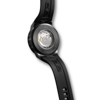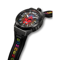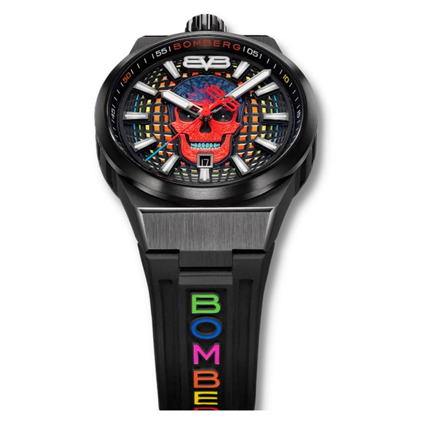 Корпус: Круглый корпус выполнен из нержавеющей стали. Стойкое к царапинам DLC покрытие черного цвета. Черный циферблат гобеленовый циферблат с изображением черепа, эргономичная завинчивающаяся заводная головка на 12 часах из нержавеющей стали. Аппликация часовых индексов, в виде дубинок и стрелки с покрытием Super-Luminova®. Сапфировое стекло с антибликовым покрытием. Диаметр корпуса 43 мм, толщина - 14,5 мм. Задняя крышка с прозрачным стеклом. Водостойкость 100 метров.