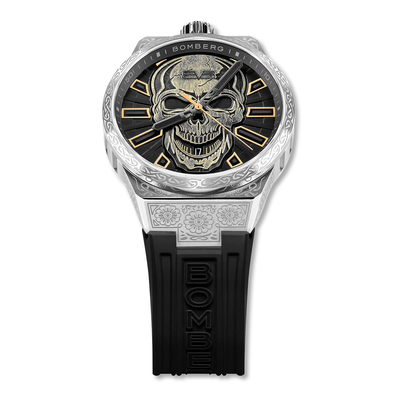 Корпус: Круглый корпус из нержавеющей стали украшен замысловатой гравировкой Древа Жизни, символизирующей гармонию и связь. Черный циферблат, эргономичная завинчивающаяся заводная головка на 12 часах. На циферблате изображен уникальный рельефный череп. Фотолюминесцентное покрытие Super-Luminova® на глазах и зубах, а также на индексах и стрелках добавляет остроты, обеспечивая при этом идеальную читаемость даже в самых темных условиях. Индексы и стрелки с покрытием Super-Luminova®. Сапфировое стекло с антибликовым покрытием. Диаметр корпуса 43 мм, толщина - 14,2 мм. Задняя крышка с прозрачным стеклом. Водостойкость 100 метров.
