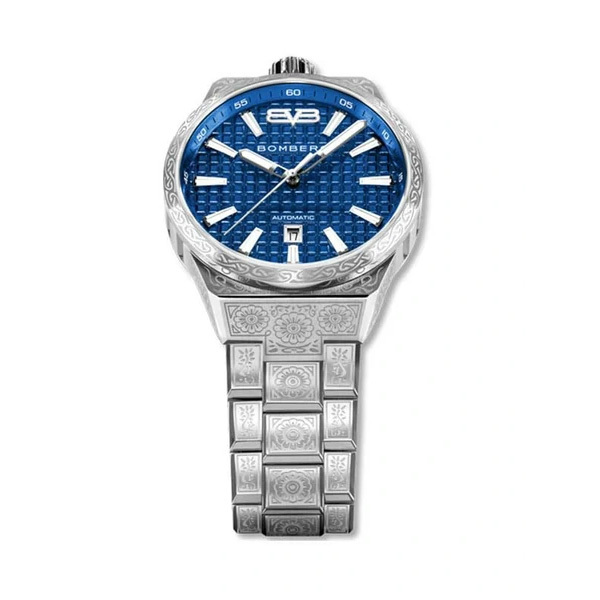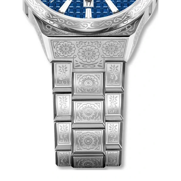 Корпус: Круглый корпус из нержавеющей стали украшен замысловатой гравировкой Древа Жизни, символизирующей гармонию и связь. Синий циферблат, эргономичная завинчивающаяся заводная головка на 12 часах из нержавеющей стали. Аппликация часовых индексов и стрелки с покрытием Super-Luminova®. Сапфировое стекло с антибликовым покрытием. Диаметр корпуса 43 мм, толщина - 14,2 мм. Задняя крышка с прозрачным стеклом. Водостойкость 100 метров.