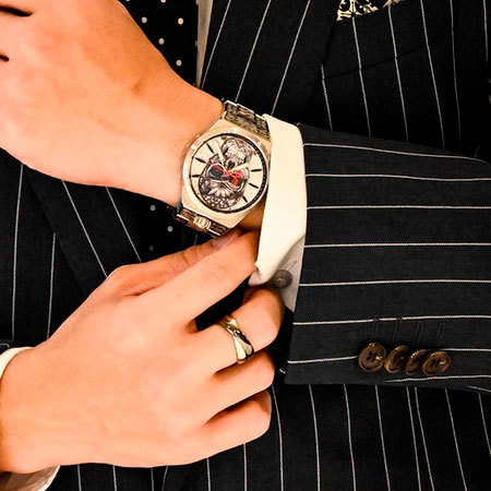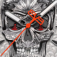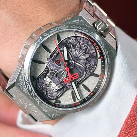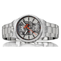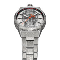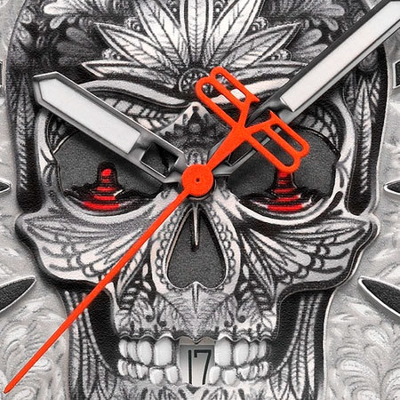 Корпус: Круглый стальной корпус марки 316L украшены лазерной гравировкой. Серебристый циферблат с метками в виде штрихов украшен гравировкой и большим черепом. Мечевидные стрелки с люминесцентным покрытием(Super-LumiNova). Сапфировое стекло с антибликовым покрытием. Завинчивающаяся заводная головка на 12ч. Диаметр: 43 мм. Водозащита: 100 м.