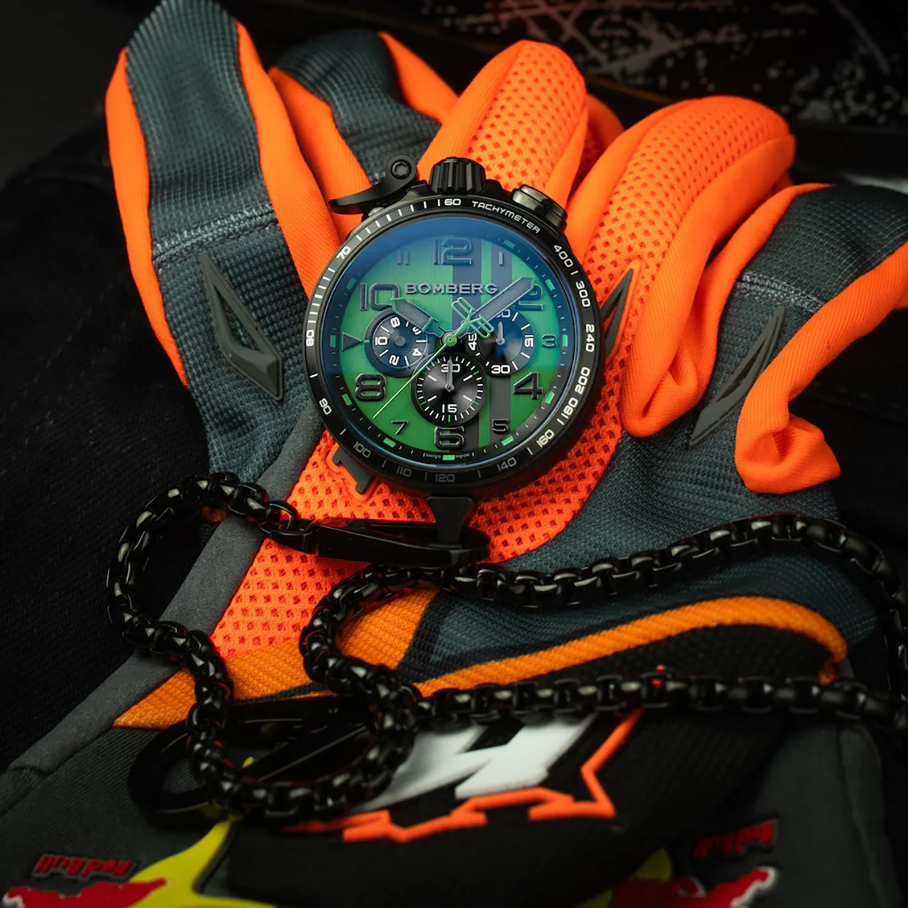 Корпус: Круглый корпус выполнен из нержавеющей стали марки 316L. Стойкое к царапинам PVD покрытие черного цвета. Черный алюминиевый безель тахометра. Зелёный циферблат. Уникальный дизай с завинчивающейся заводной головкой в положении «12 часов», кнопкой в положении «1» и рычагом в положении «11» вдохновлен искусством автоспорта и гонок. Аппликация часовых индексов и стрелки с покрытием Super-Luminova®. Сапфировое стекло с антибликовым покрытием. Диаметр корпуса 45 мм, толщина - 13 мм. Водостойкость 50 метров.