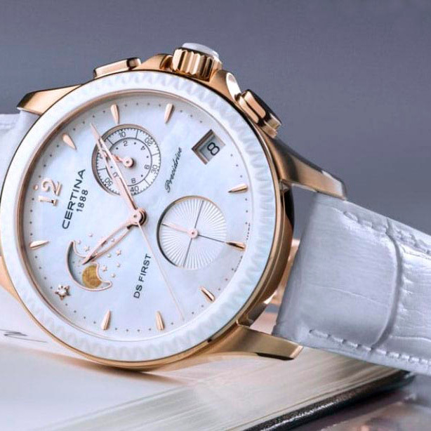 Корпус: Корпус из нержавеющей полированной стали с PVD покрытием розового золота и рельефным керамическим безелем. Белый перламутровый циферблат с золотистыми стрелками и рисками, один бриллиант на месте условного часового индекса (10 часов). Сапфировое стекло с антибликовым покрытием. Диаметр 38 мм. Водостойкость 100 м.