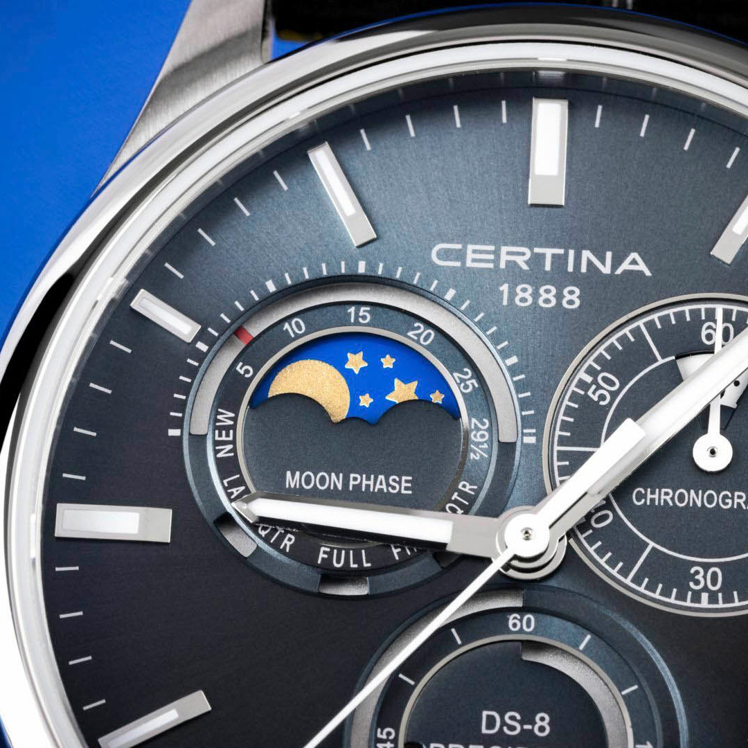 Функции: Индикация часов, минут при помощи центральных стрелок. Хронограф с 12-ти часовым, 60-ти секундным и 30-ти минутным счетчиками, индикация фазы луны и лунного цикла, индикация даты на "4" часа, вынесенная секундная стрелка на "6" часов.