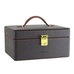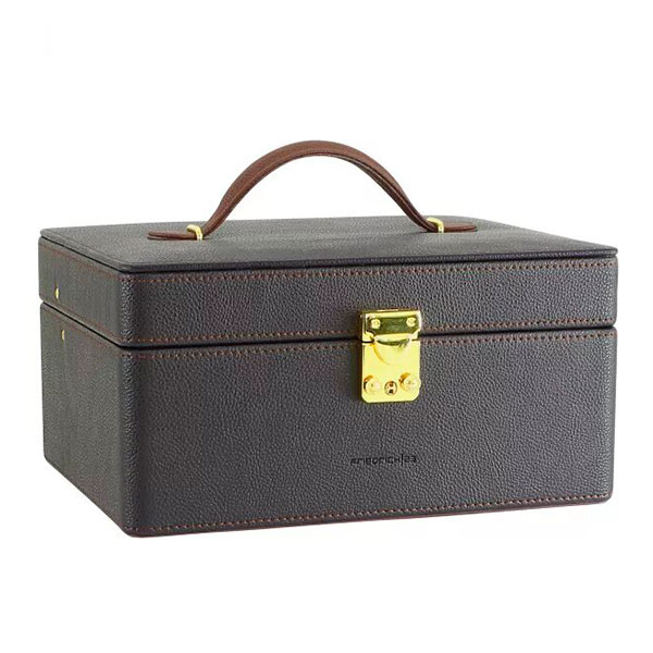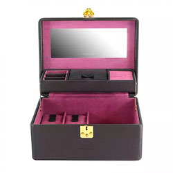 Описание: Шкатулка для хранения украшений "Ascot". Шкатулка изготовлена из высококачественной экокожи темно-коричневого цвета. Внутренняя отделка выполнена из велюра фиолетового цвета. Шкатулка состоит из множества отделений различных размеров. Верхний ярус: одно большое отделение, валики для хранения колец и серег, два перфорированных органайзера для хранения серег. Нижний ярус: одно большое отделение, четыре отделения с подушками для хранения часов. Большое зеркало с логотипом. Закрывается на замок. Удобная ручка для переноски.