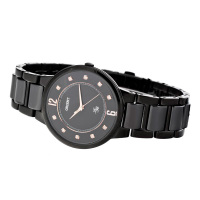 Корпус: Корпус этих часов выполнен из нержавеющей стали с IP покрытием чёрного цвета. Минеральное стекло. Чёрный циферблат украшен кристаллами. Диаметр корпуса 36 мм, толщина 9 мм. Водоустойчивость 30 метров.