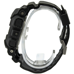 Корпус: Противоударный корпус чёрного цвета из полимерного материала защищает механизм от ударов и вибрации. Часы защищены от магнитных полей. Высококонтрастный электронный черный ЖК-циферблат защищен акриловым стеклом.Циферблат подсвечивается светодиодом, функция автоподсветки освещает циферблат при повороте часов к лицу. Цвет подсветки оранжевый. Размер 55 мм x 51,2 мм х 16,9 мм. Водозащита 200 метров.