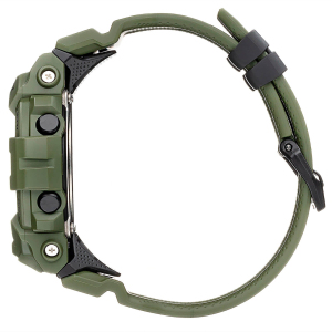 Корпус: Противоударный корпус матового цвета хаки из полимерного материала с высоким безелем, дополнительно защищающим закаленное минеральное стекло. Корпус защищён от повреждений и деформаций при ударах. Высококонтрастный LCD-индикатор циферблата оснащен автоматической электронной подсветкой, которая активируется поворотом кисти. Цвет подсветки белый. Модели этой серии оснащены многосегментными цифровыми дисплеями для улучшения читаемости. Цифровой дисплей разделен на верхнюю и нижнюю секции, в правом верхнем углу находится цифровой диск. Каждая область отображения показывает различные измерения, хронометраж и другую информацию, которая предоставляет полезные данные о вашей повседневной деятельности. Размер 48,6 мм x 54,1 мм х 15,5 мм. Водозащита 200 метров.