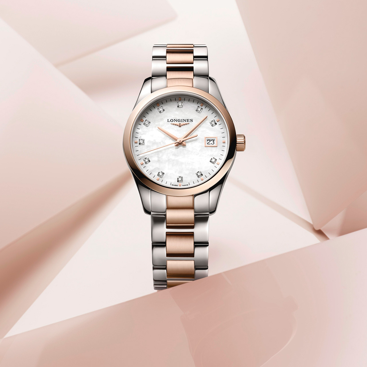 Корпус: Нержавеющая сталь марки 316L, поверхности с матовой шлифовкой сатинированием и глянцевой полировкой. Безель и заводная головка с PVD-покрытием цвета розового золота. Циферблат белый перламутровый циферблат декорирован 11 бриллиантами. Аппликация часовых индексов, а также стрелки с алмазной огранкой имеют золотое покрытие и полировку. Устойчивое к царапинам сапфировое стекло с многослойным антибликовым покрытием изнутри. Водонепроницаемость 50 метров. Диаметр 34 мм.