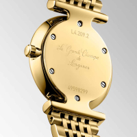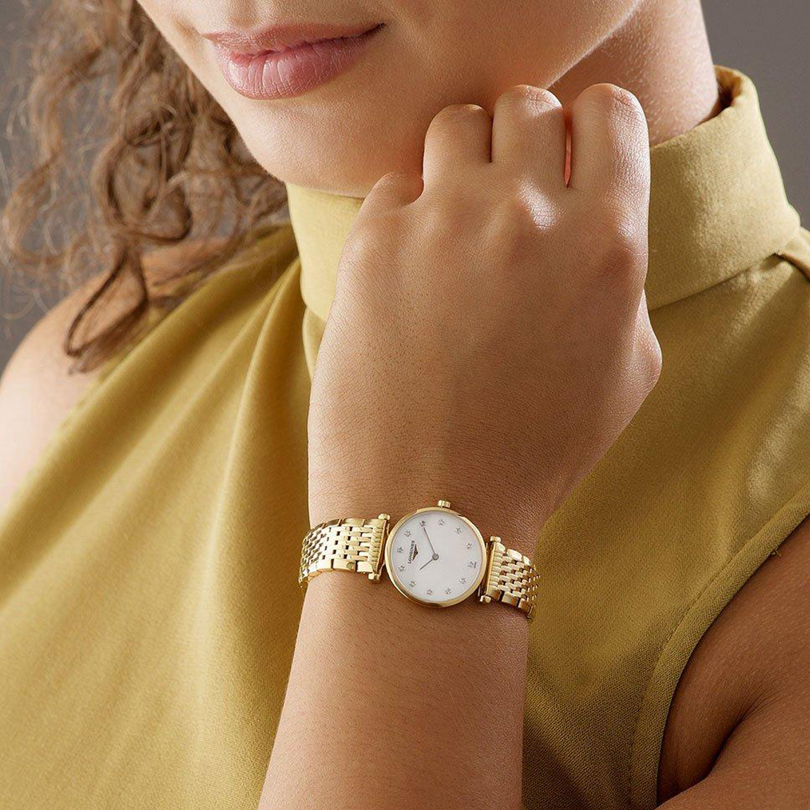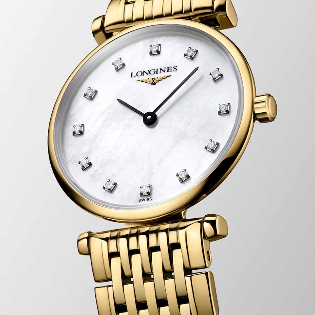 Корпус: Нержавеющая сталь + PVD-покрытие из желтого золота, сапфировое стекло, 12 бриллиантов на циферблате. Размер 24 мм, водонепроницаемость 30 метров. Циферблат – перламутровый белый.