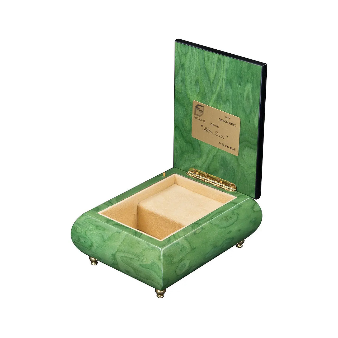 Материал: Корпус музыкальной шкатулки Kitten Kisses выполнен из дерева, отполирован и покрыт специальным лаком. Сандра Кук — одна из самых известных и востребованных художниц в Северной Америке. Ее элегантная техника, изысканные детали и лирические композиции сочетаются с любимой всеми тематикой. Милые красивые дети, молодые матери с младенцами, величественные комнаты, пышные цветочные платья - одни из ее любимых тем. Внутренняя часть шкатулки тщательно вырезается из специально обработанной древесины, которая никогда не деформируется, а затем покрывается натуральным красным деревом, добытым из корней дерева, где прожилки более заметны. После нескольких этапов тщательной шлифовки, полировки и лакировки на крышку наносится изображение художника. Каждая шкатулка изнутри отделана плюшевым бархатом, а все привлекательные детали из золотистого металла обработаны, чтобы избежать потускнения. Наконец, вся шкатулка подвергается трёхэтапному покрытию, которое полностью защищает её от внешних воздействий и гарантирует, что она будет долго храниться. Для каждого изображения подбирается красивая и подходящая музыкальная тема, которая превращается в музыкальное произведение высочайшего качества. Механизм встроен в каждую шкатулку и срабатывает при открытии крышки. Бренд воплощает итальянское наследие и мастерство в каждом изделии, создавая неподвластные времени сувениры.