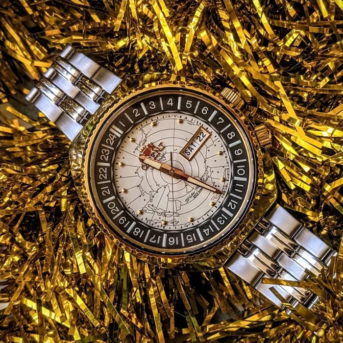 Корпус: Корпус из нержавеющей стали с IP покрытием цвета желтого золота по безелю. Циферблат цвета слоновой кости с метками в виде точек украшен изображением карты мира. Минеральное стекло крайне устойчиво к повреждениям. Диаметр корпуса: 44 мм. Толщина: 14 мм. Водонепроницаемость: 200 м.