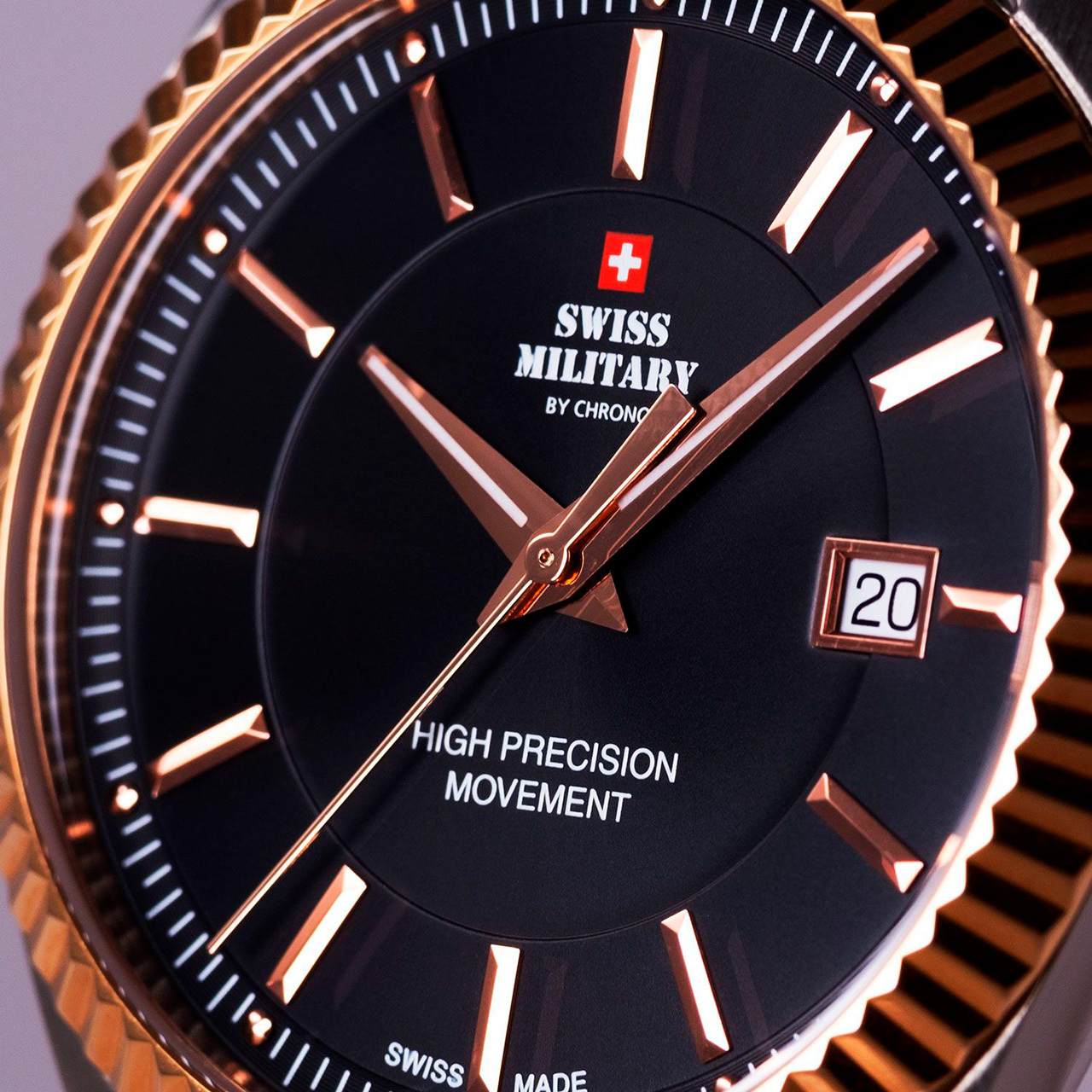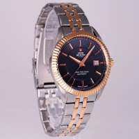 Корпус: Корпус выполнен из нержавеющей стали с частичным PVD покрытием цвета розового золота. Чёрный циферблат. Минеральное стекло с сапфировым покрытием. Водонепроницаемость 50 метров. Диаметр 40 мм.