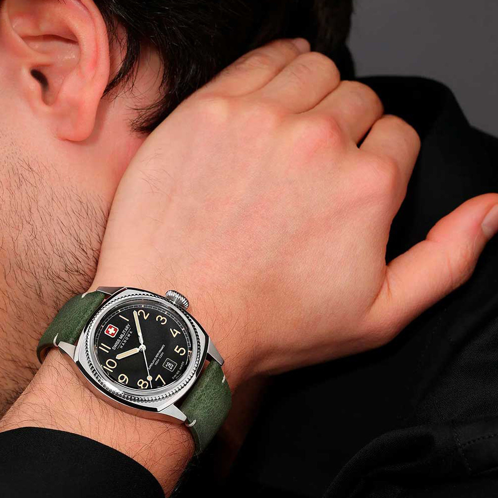 Корпус: Стальной винтажный корпус с шлифованным модифицированным безелем с плоским ребристым краем в виде монеты. Циферблат с пескоструйной отделкой дополнен фирменным логотипом Swiss Military Hanowa. Накладные метки в виде арабских цифр. Заостренные прямоугольные стрелки в стиле Baton. Метки и стрелки с люминесцентным покрытием, которое светится в темноте после непродолжительной зарядки на свету. Сапфировое стекло устойчивое к появлению царапин, обладающее высокой прозрачностью. Рифленая заводная головка в пилотском стиле, украшена фирменным логотипом. Завинчивающаяся задняя крышка. Диаметр 41 мм. Водонепроницаемость 100 м.