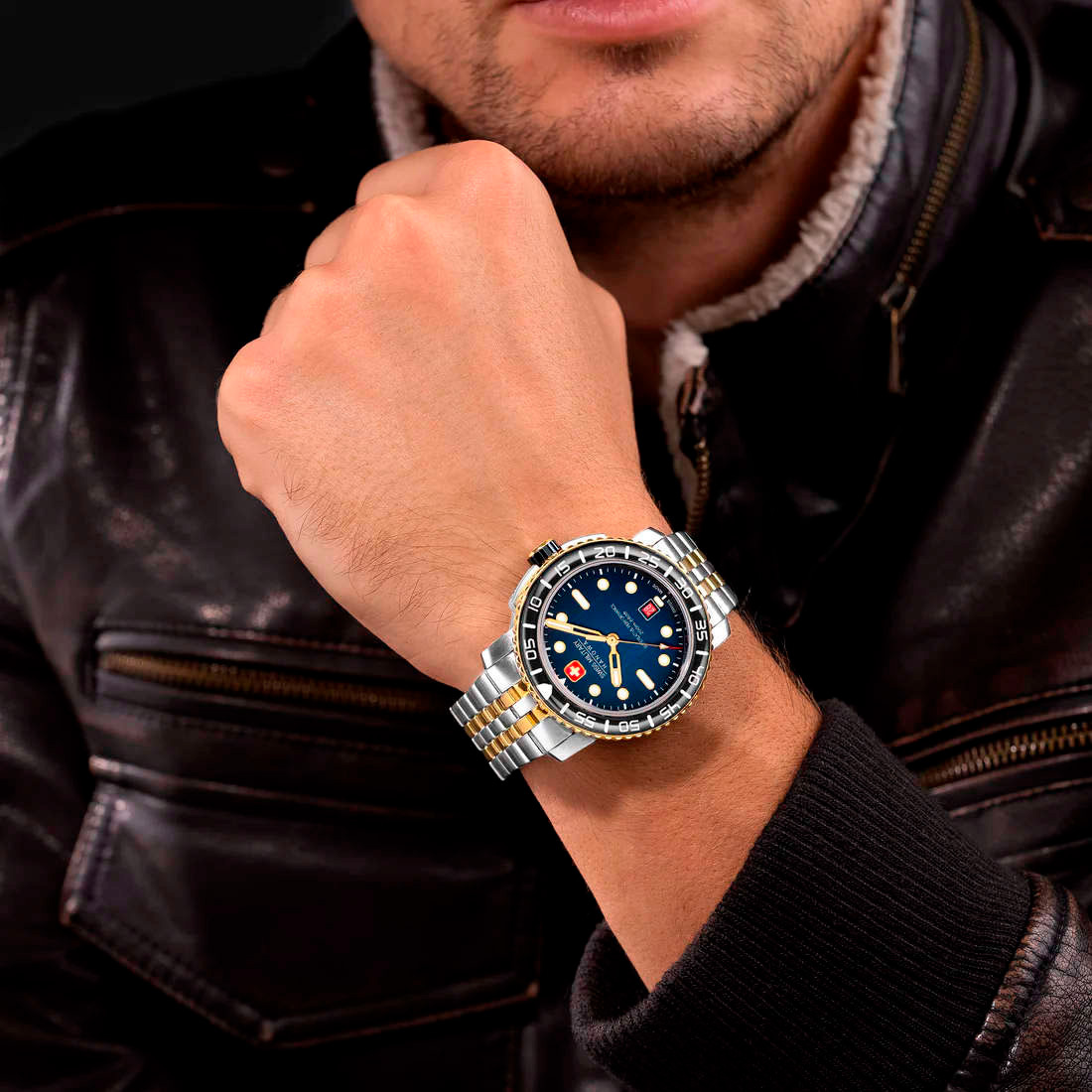 Корпус: Корпус модели выполнен из высококачественной стали с повышенной устойчивостью к коррозии, с частичным IP покрытием из желтого золота. Синий безель. Синий циферблат, украшен узором "гильоше". Позолоченные стрелки и часовые индексы в виде штрихов и точек с люминесцентным покрытием Super-LumiNova для оптимальной разборчивости в условиях низкой освещенности. Сапфировое стекло с антибликовым покрытием. Рифленая заводная головка. Диаметр: 44 мм. Водонепроницаемость: 200 м.
