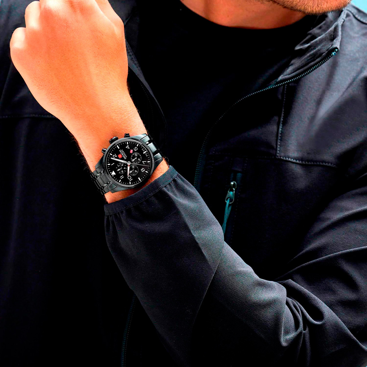 Корпус: Корпус выполнен из нержавеющей стали 316L с PVD покрытием. Циферблат выполнен по технологии Sunray (солнечные лучи) чёрного цвета. Метки выполнены в виде арабских цифр и штрихов. Люминесцентное покрытие на часовой и минутной стрелках позволяет считывать показания в темноте. Сапфировое стекло устойчивое к появлению царапин, обладающее высокой прозрачностью. Рифленая заводная головка украшена фирменным логотипом. Диаметр 43 мм. Водонепроницаемость 100 м.