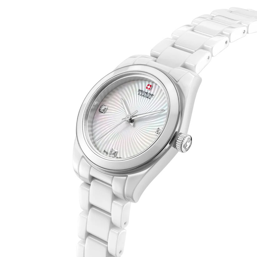 Корпус: Круглый корпус из керамики белого цвета. Белый перламутровый циферблат, украшен тремя искусственными бриллиантами. Стрелки с люминесцентным покрытием, которое светится в темноте после непродолжительной зарядки на свету. Сапфировое стекло устойчивое к появлению царапин, обладающее высокой прозрачностью. Диаметр: 31,5 мм. Водонепроницаемость: 50 м.