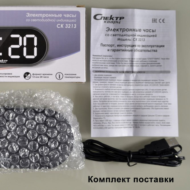 Механизм: Часы настольные с цифровой индикацией с будильником и измерением температуры. Яркость свечения часов можно менять (три уровня яркости) или полностью отключить индикацию. В режиме выключенной индикации нажатие любой кнопки кратковременно включит индикацию. Также у часов есть ночной режим работы индикации, который позволяет автоматически снизить яркость свечения в тёмное время суток. При включённом ночном режиме, в настроенный промежуток времени яркость индикации дисплея автоматически будет установлена на минимальный уровень. Часы могут работать в трёх режимах: отображение текущего времени, отображение температуры окружающего воздуха и режим попеременного отображения времени и температуры. Две центральные точки на дисплее часов не мигают. Часы могут работать, в том числе, только от батареек, т.е. без подключения к внешнему источнику питания. Когда часы работают только от батареек, дисплей всё время выключен, при этом нажатие любой кнопки или кратковременное нажатие на корпус часов сверху включит индикацию примерно на 10 секунд. У часов есть один будильник. Температура может показываться в градусах Цельсия или в градусах Фаренгейта. Питание осуществляется от порта USB. В комплекте с часами идёт USB шнур (1,5 метра) для питания часов от USB источника (5V). Для питания можно использовать, например, любой адаптер, предназначенный для зарядки мобильных телефонов, и имеющий USB выход. Блока питания от сети 220V в комплекте нет.
